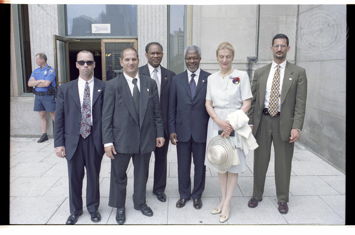 Secretary-General and Mrs. Annan (third and second from right) meeting with Philadelphia's Mayor John F. Street (third from left) and staff.