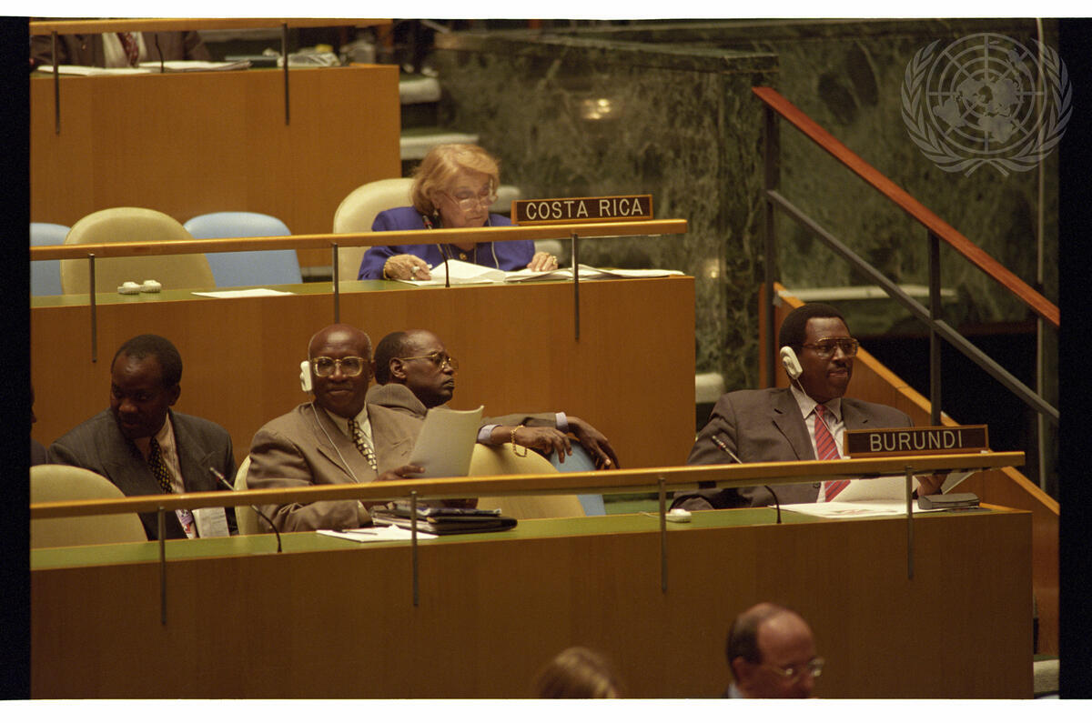 Therence Sinunguruza (right, behind nameplate), Minister for External Rclations of the Republic of Burundi, heads his nation's delegation to the fifty-sixth session of the General