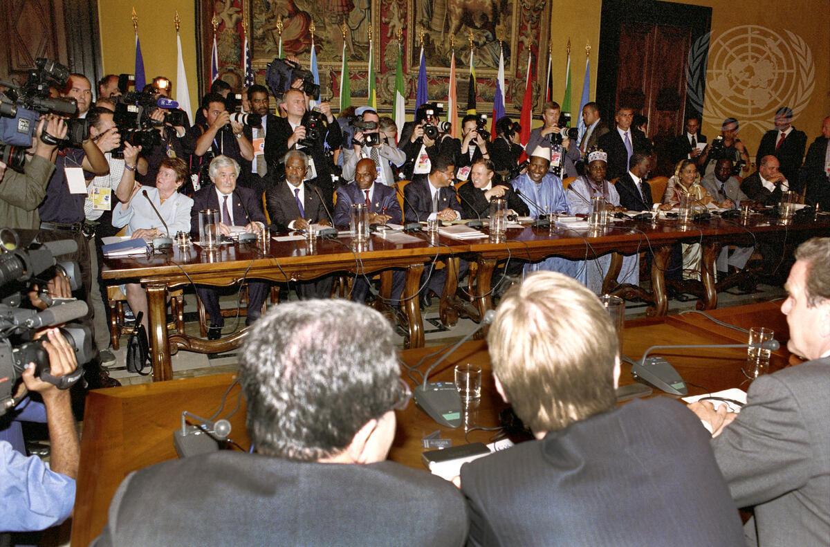 Secretary-General Kofi Annan (third from left) attends the outreach session of the G-8 Summit. Seated to his left: Gro Brundtland, Director-General of the World Health Organization (WHO); James Wolfensohn, President of the World Bank. Seated to his right: Abdoulaye Wade, President of Senegal; Francisco Guillermo Flores Perez, President of El Salvador; Abdelaziz Bouteflika, President of Algeria; Alpha Oumar Konare, President of Mali; Olusegun Obasanjo, President of Nigeria; Thabo Mbeki, President of South Africa; Sheikh Hasina, Prime Minister of Bangladesh; Jacques Diouf, Director-General of the Food and Agriculture Organization (FAO); and Mike Moore, Director-General of the World Trade Organization (WTO).