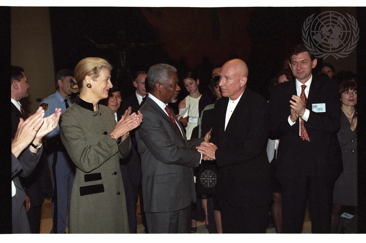 Mrs. Nane Annan (left) and Secretary-General Kofi Annan (second left) attend the opening of an exhibition by photographer Sebastião Salgado (second right). The exhibition features work drawn from Salgado's recently published books The Children and Migrations.