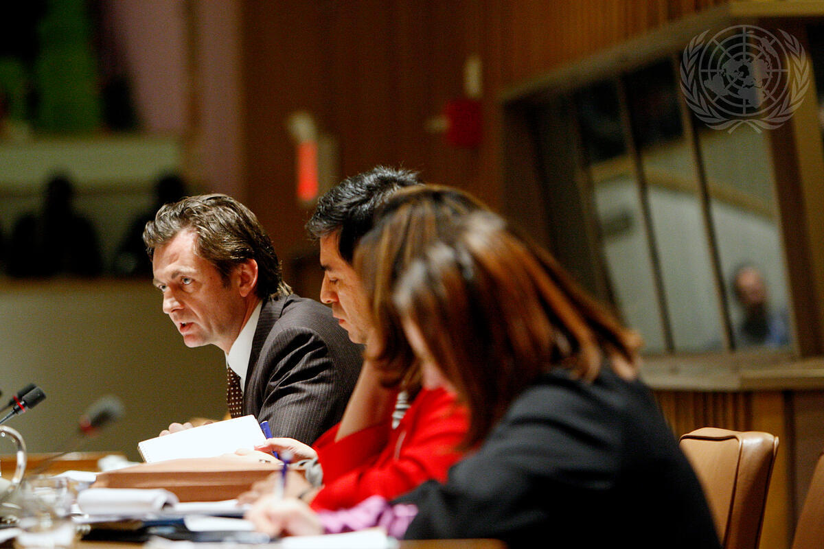 Christian Wenaweser (left), Permanent Representative of Liechtenstein to the United Nations, and President-elect of the Assembly of States Parties (ASP) of the International Criminal Court (ICC), addresses the first round of the election of ICC judges during the first resumed seventh session of the Assembly of States Parties to the Rome Statute.