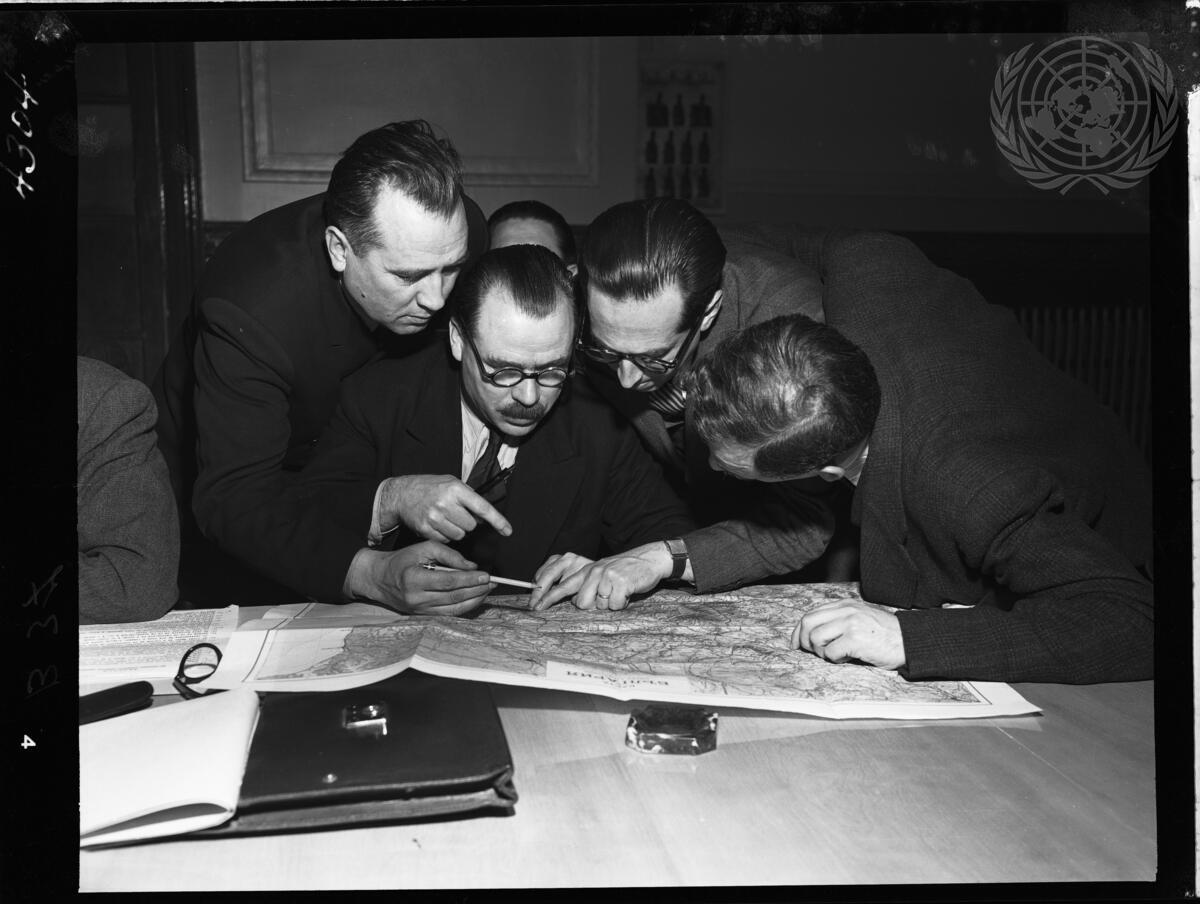 The Bulgarian delegation consults a map of the Greek frontier. [February or March 1947]