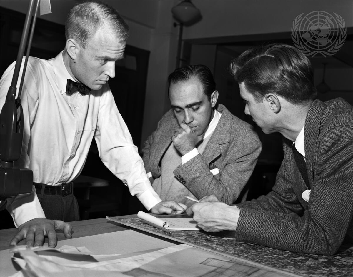 Thaddeus Crapester, left, and George Dudley, right, explain to Consultant Architect Oscar Niemeyer, of Brazil, the preliminary plans for the United Nations permanent headquarters on the Manhattan East River site.
