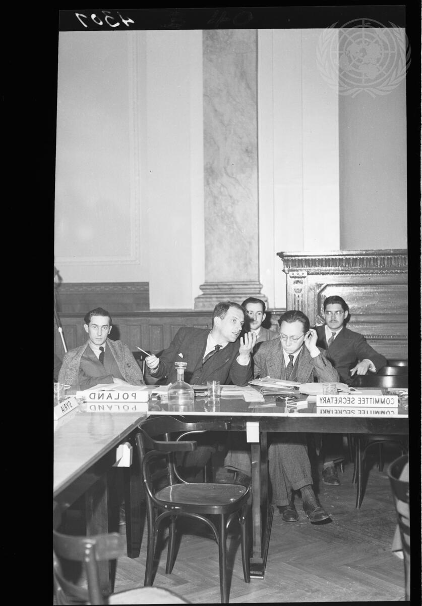 Jerzy Putrament, Chief of the Polish delegation, interrogates a Greek witness. Gustav Gottesman (right), Deputy Principal Secretary of Commission. [February or March 1947]