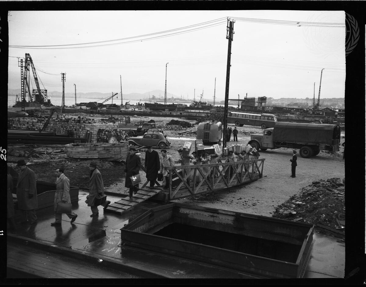 Delegates and members of the Secretariat arrive at the French cruiser “Georges Leygues” for the voyage to Athens. [January or February 1947]