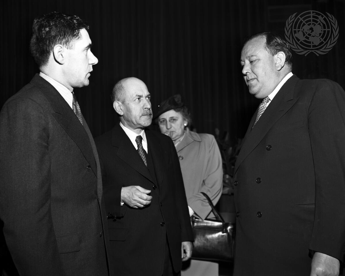In delegates lounge before meeting, L-R: Andrei A Gromyko, USSR, Del. chairman, Perm. rep., Assembly Vice-President. Alfred Fiderkiewicz, Poland, alternate Trygve Lie, Norway, UN Secretary-General.
