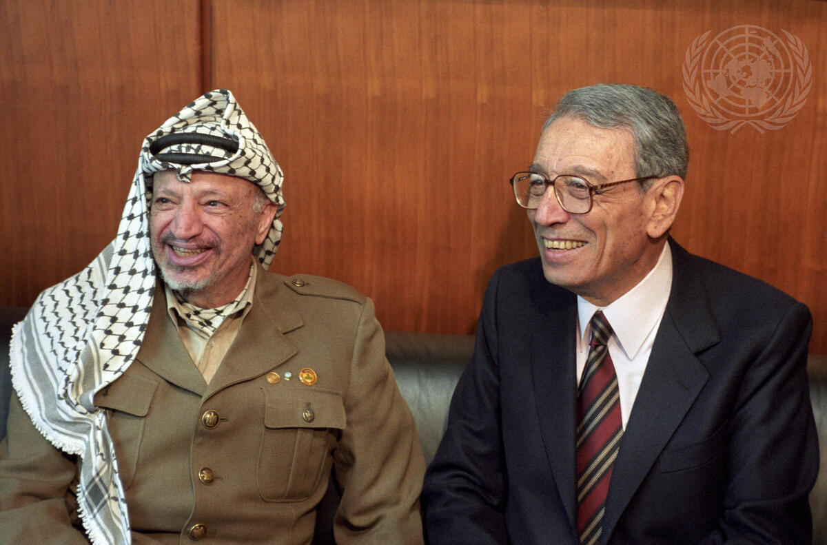 Secretary-General Boutros Boutros-Ghali (right) meets with Yasser Arafat, Chairman of the Executive Committee of the Palestine Liberation Organization (PLO).