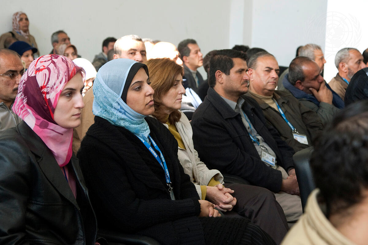 Staff members of the United Nations Relief and Works Agency for the Palestine Refugees in the Near East (UNRWA) attend a meeting with Secretary-General Ban Ki-moon.