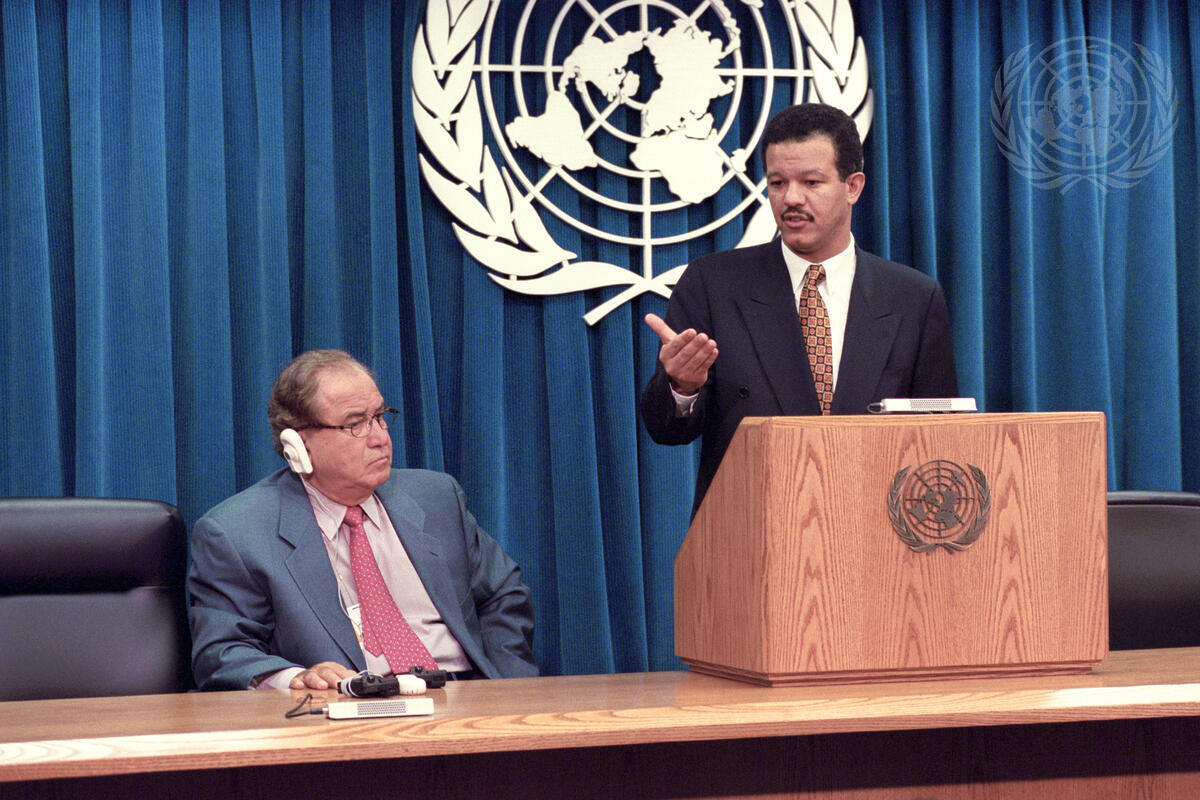 Leonel Fernandez Reyna, Constitutional President of the Dominican Republic, addresses a press conference at Headquarters. On the left is Samir Sanbar, Assistant Secretary-General for Public Information.