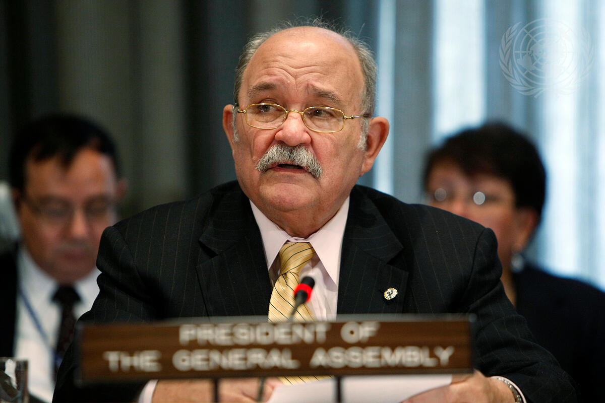 Miguel d'Escoto Brockmann, President of the sixty-third session of the General Assembly, adresses a meeting of the Group of 77 of developing countries and China, during the hand-over ceremony of the Chairmanship from Antigua and Barbuda to the Republic of the Sudan.