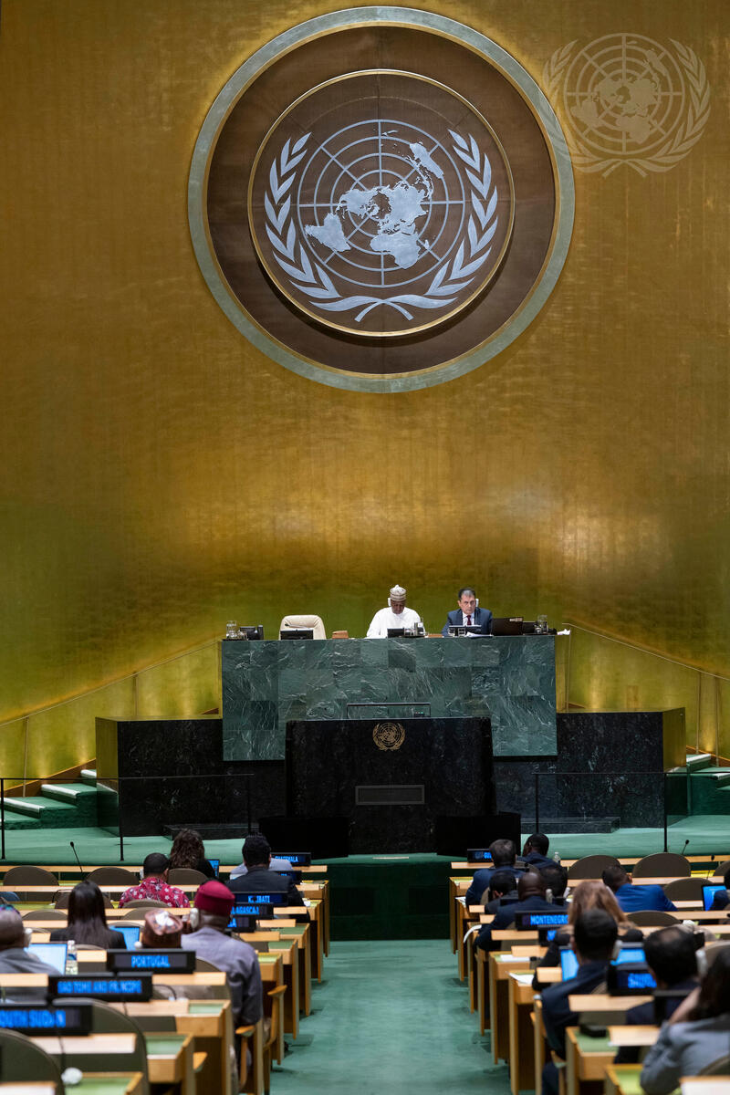 Tijjani Muhammad-Bande (left), President of the seventy-fourth session of the General Assembly, closes the general debate of the seventy-fourth session of the General Assembly. At right is Movses Abelian, Under-Secretary-General for General Assembly and Conference Management.