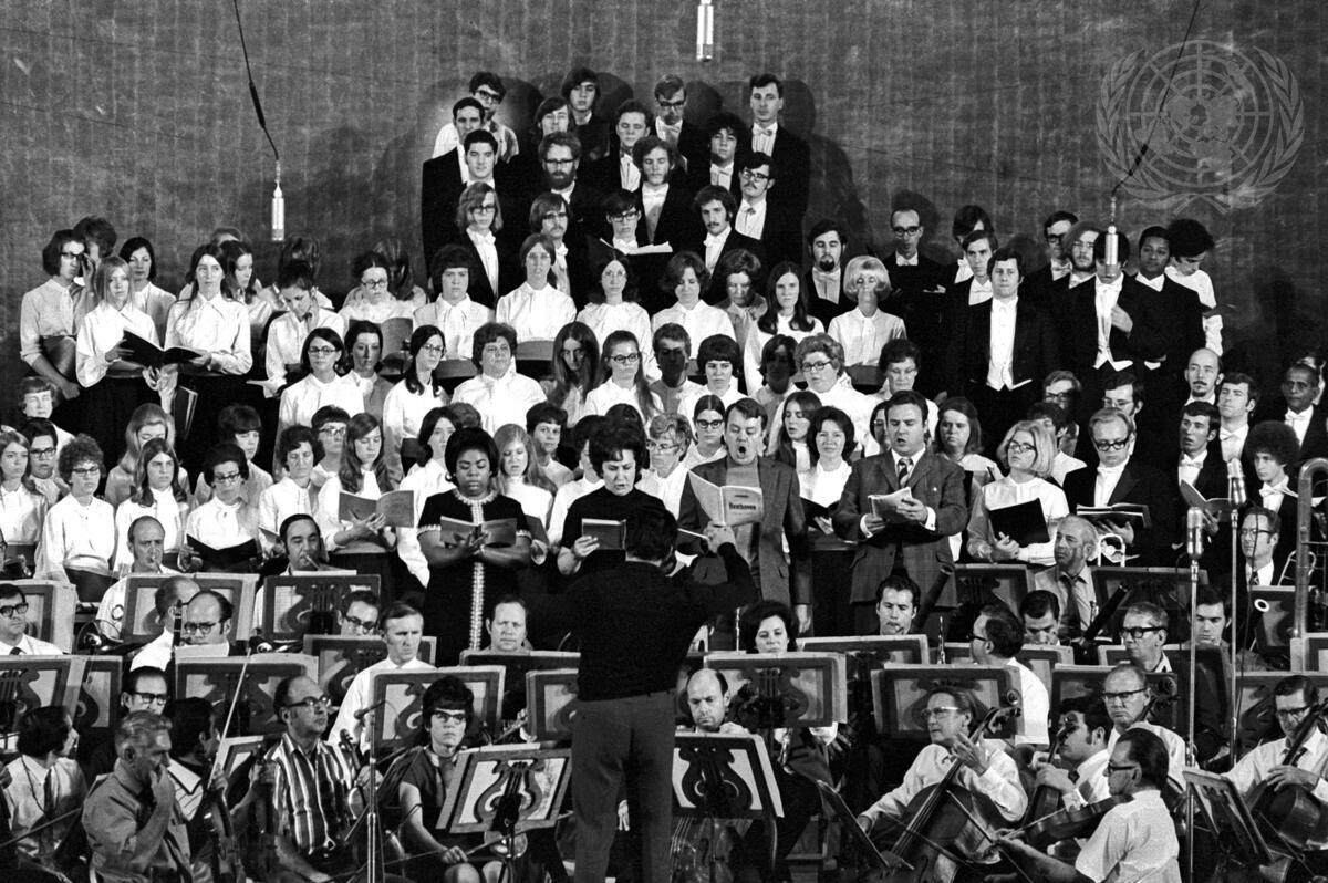 The 1970 United Nations Day Concert was held in the General Assembly Hall at United Nations Headquarters tonight. ""Cosmogony"", a new composition for soloists, chorus and orchestra by the Polish composer Krzysztof Penderecki, which was commissioned by UN Secretary-General, U Thant, to mark the twenty-fifth anniversary of the United Nations, was performed by the Los Angeles Philharmonic Orchestra, with the Rutgers University Choir and soloists, under the direction of Zubin Mehta.