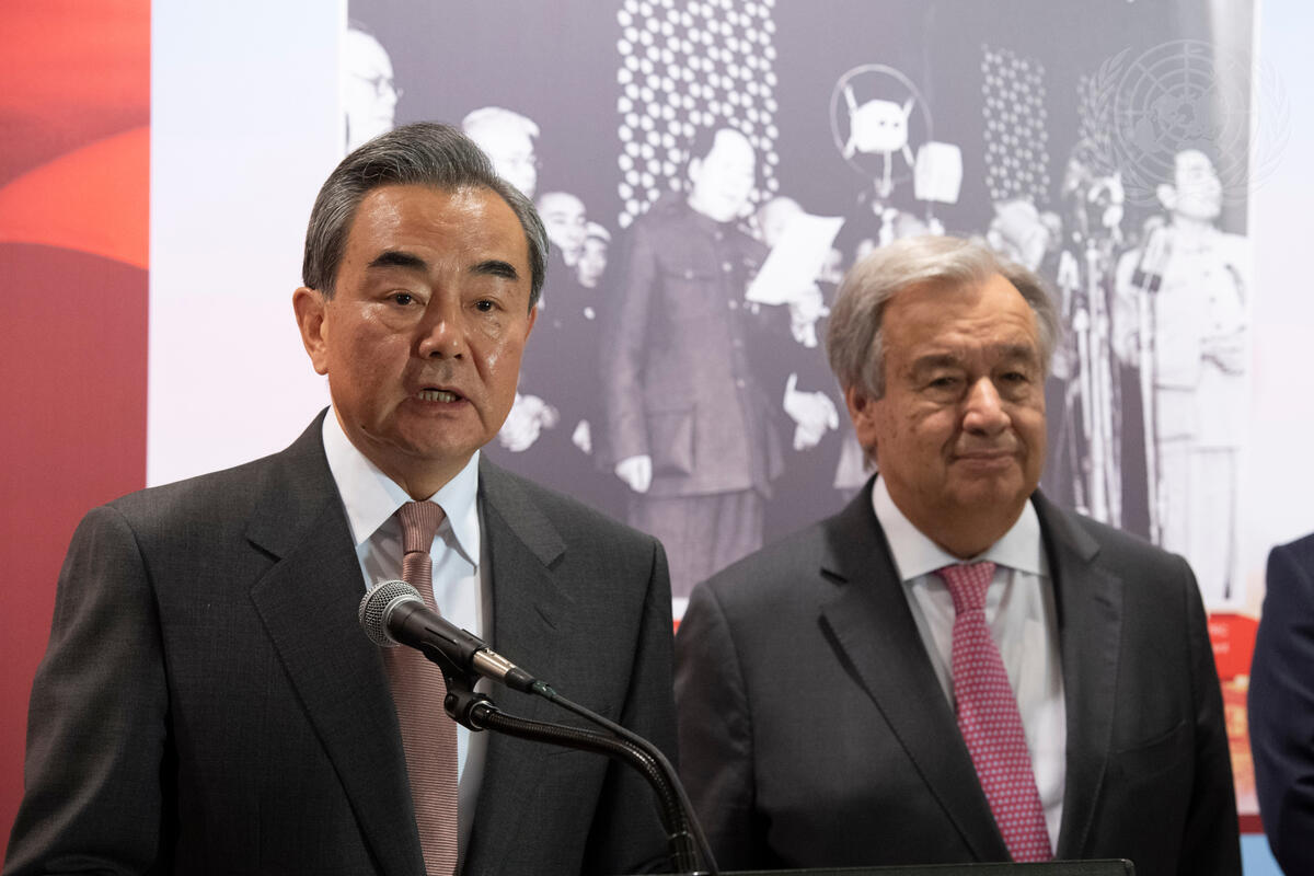 Wang Yi (left), Minister for Foreign Affairs of the People’s Republic of China, delivers remarks at the opening ceremony of the photo exhibit on the occasion of the 70th Anniversary of the founding of the People’s Republic of China, while Secretary-General António Guterres looks on.