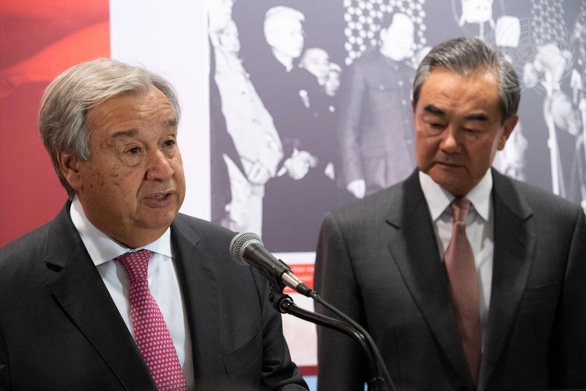 Secretary-General António Guterres (left) delivers remarks at the opening ceremony of the photo exhibit on the occasion of the 70th Anniversary of the founding of the People’s Republic of China. Also present is Wang Yi, Minister for Foreign Affairs of the People’s Republic of China.