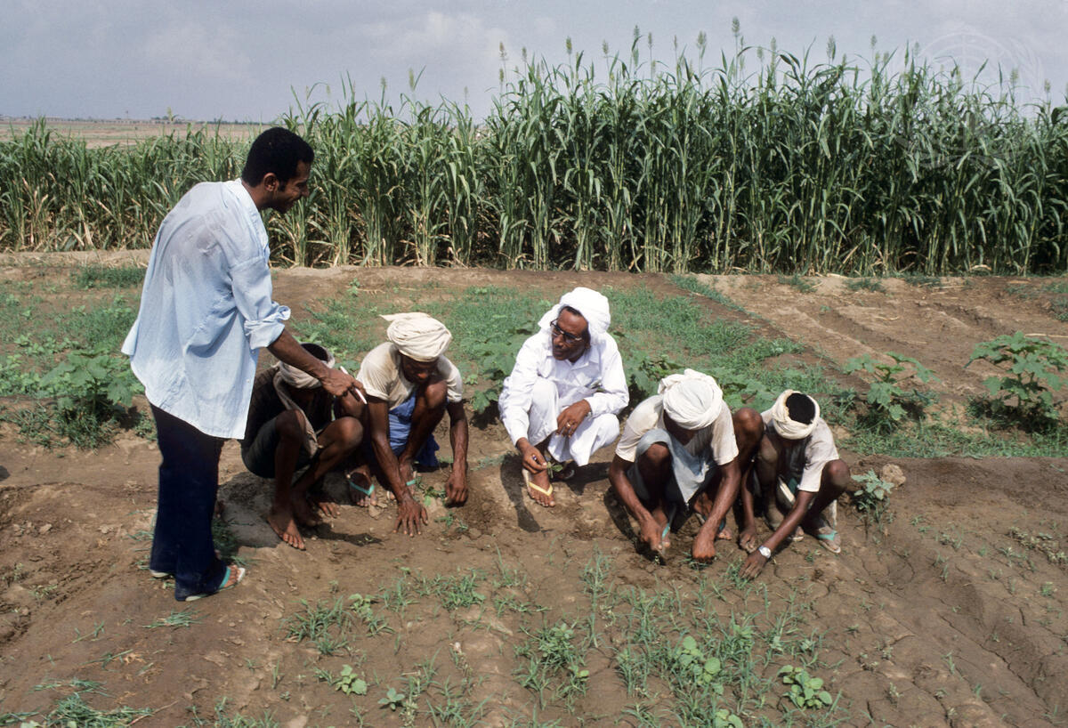At the research farm, in Hudaydah which is operated with assistance from the Food and Agriculture Organization (FAO), work in a maize field being done under the supervision of a UN Volunteer. Agriculture in Yemen is largely of a subsistence nature with grains, fruits, vegetables and cotton being the main crops. With help from UN agencies, the Government is carrying out agricultural development programmes aimed at improving the standard of living of its people. 1975.