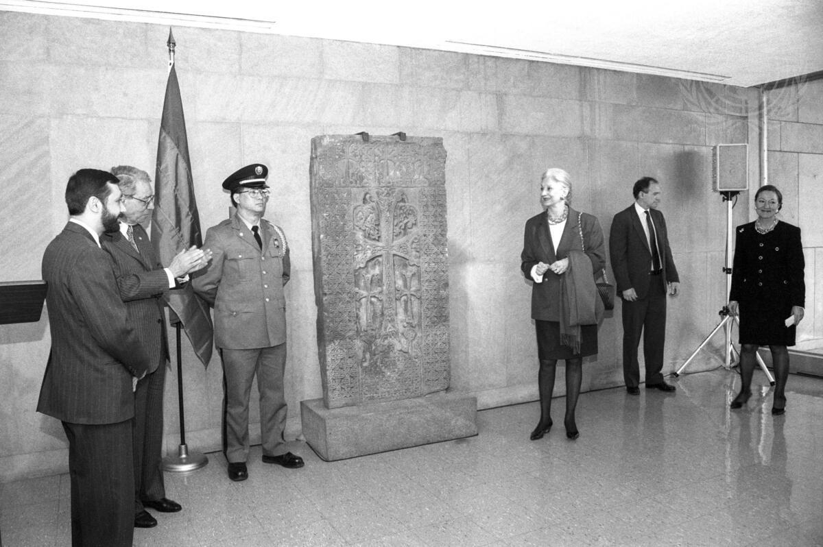 Ambassador Alexander Arzoumanian (extreme left), Permanent Representative of Armenia, presents a Khatchkar, known as the Holy Lance, an architectural example from the 13th century.