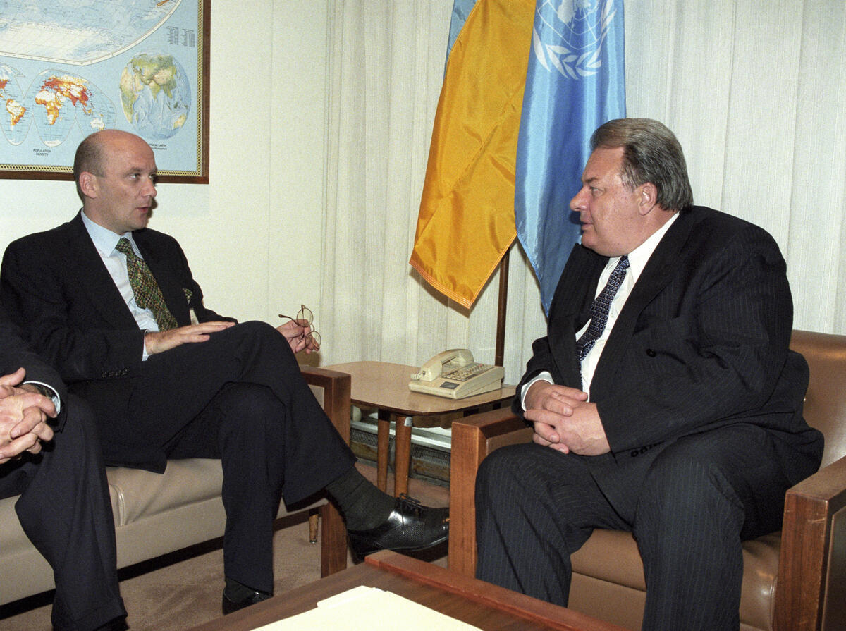 Hennadiy Udovenko (right), Ukraine, President of the fifty-second session of the General Assembly, meeting with Jadranko Prlic, Minister for Foreign Affairs of Bosnia and Herzegovina.