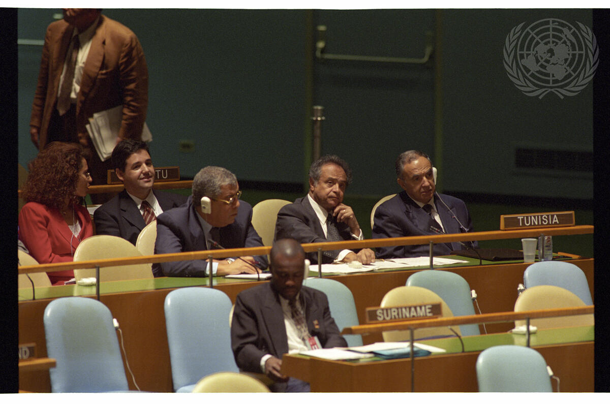 The delegation of Tunisia is seen at the fifty-seventh session of the United Nations General Assembly. At right is Habib Ben Yahia, Minister for Foreign Affairs of Tunisia.