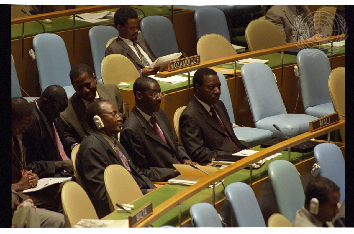 The delegation of the Republic of Mali is seen at the fifty-seventh session of the United Nations General Assembly. Behind the nameplate is Lassana Traoré, Minister for Foreign Affairs of the Republic of Mali.