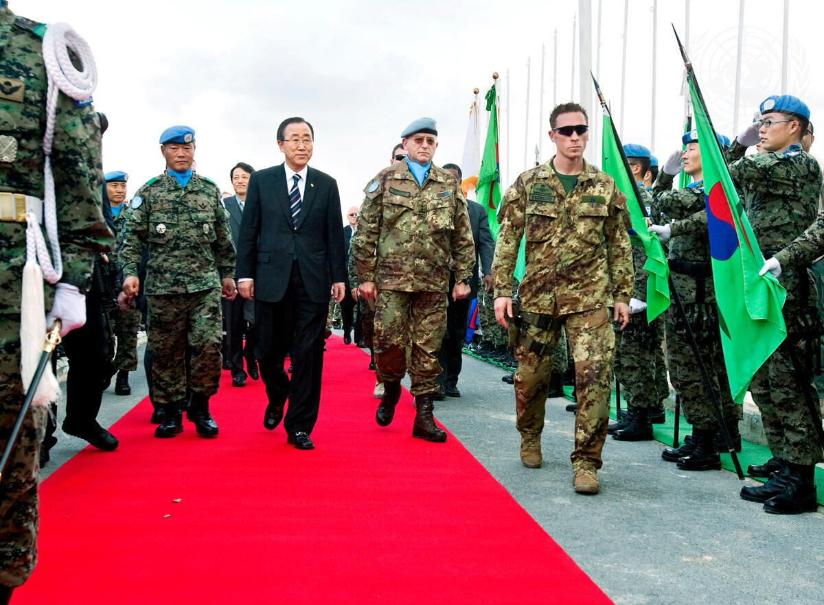 Secretary-General Ban Ki-moon (fourth from left) inspects the honour guard of the Korean Battalion of the United Nations Interim Force in Lebanon (UNIFIL).
