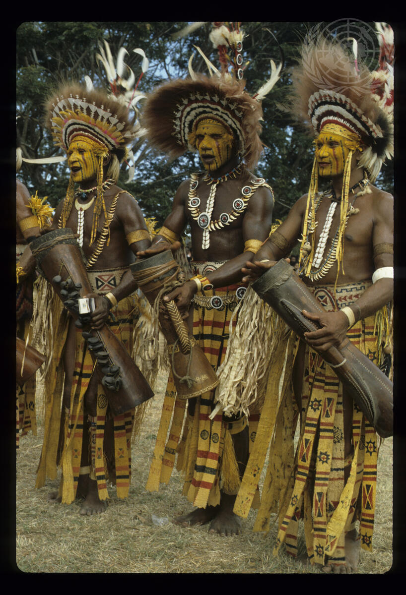Province, Papua New Guinea. Every June different tribes from around the country come here to join in the festival and perform their traditional dances. [1987]