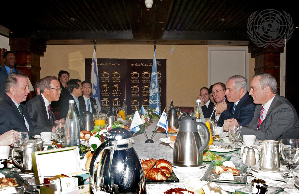Secretary-General Ban Ki-moon (second from left) holds talks with Benjamin Netanyahu (second from right), Leader of the Likud party of Israel.