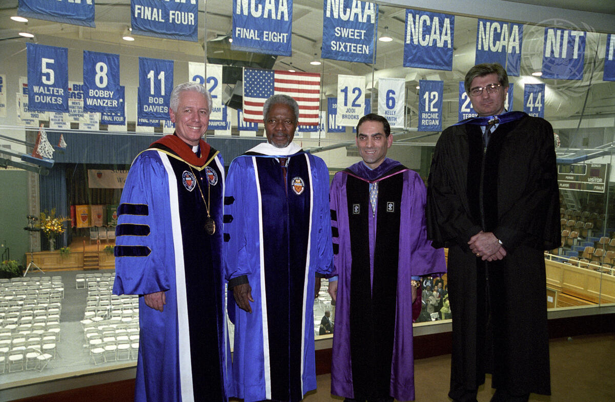 Shown is Secretary-General Kofi Annan (center) at the Honorary Degree Presentation with Monsignor Robert Sheeran (left), President of Seton Hall University and Ambassador Clay Constantinou (second from right), Dean of the School of Diplomacy and International Relations. Right is Giandomenico Picco, Personal Representative of the Secretary-General.