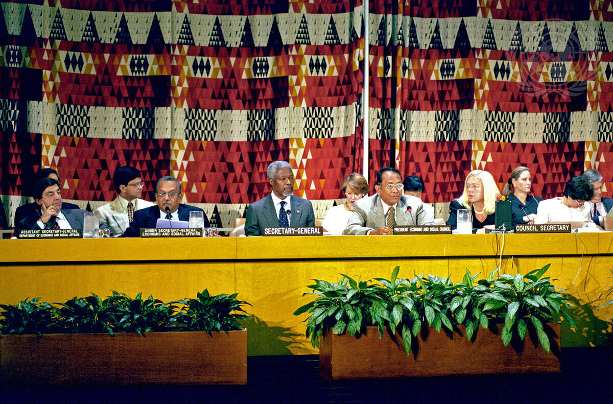 Secretary-General Kofi Annan (left) makes a closing address on the last day of the Economic and Social Council's substantive session for the year 2000. Pictures (left to right) are: Assistant Secretary-General for Economic and Social Affairs Patrizio Civili; Under-Secretary-General for Economic and Social Affairs Nitin Desai; Mr. Annan; Economic and Social Council President Makarim Wibisono (Indonesia); and Council Secretary Margaret Kelley.