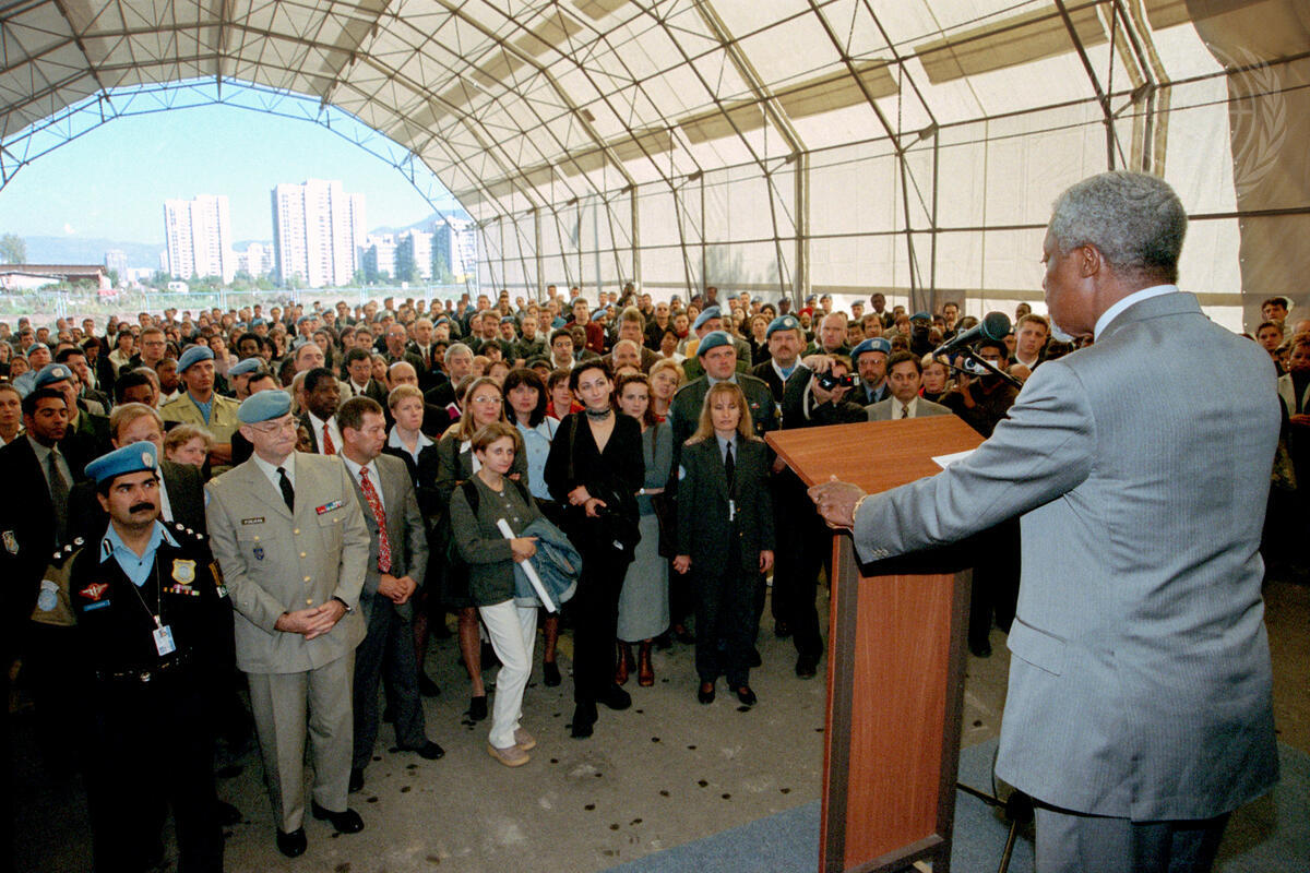 Secretary-General Kofi Annan (right) addressing the staff of the United Nations Mission in Bosnia and Herzegovina (UNMIBH).