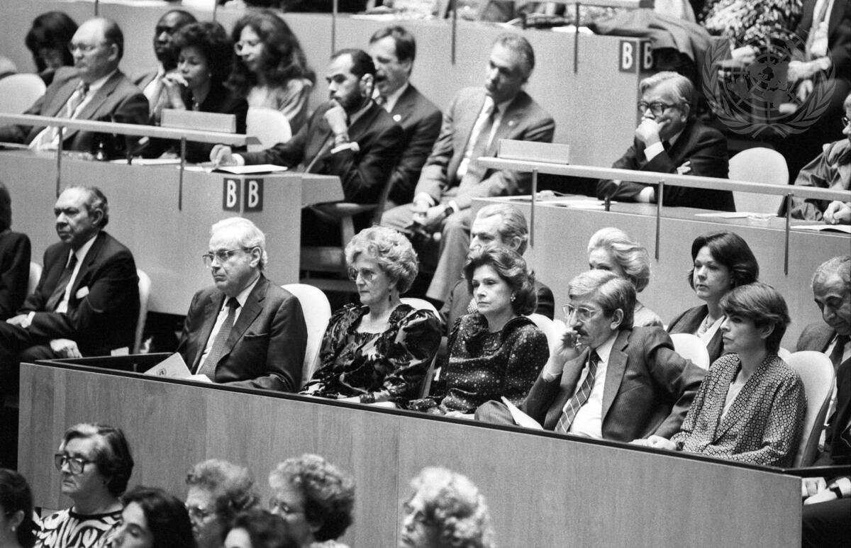 A general view of the Secretary-General Javier Perez de Cuellar and others in the audience listening to the concert.