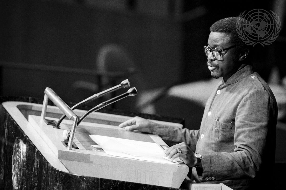 Leandre B. Bassole, Minister for Foreign Affairs of Burkina Faso, addressing the 42nd session of the UN General Assembly today. During the Assembly's three-week general debate the head of each delegation makes a formal statement of his or her Government's views on major issues.
