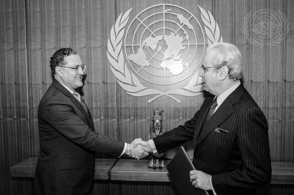 Roberto Meza (left), new Permanent Representative of El Salvador to the United Nations, shakes hands with Secretary-General Javier Perez de Cuellar after presenting his credentials today at United Nations Headquarters.