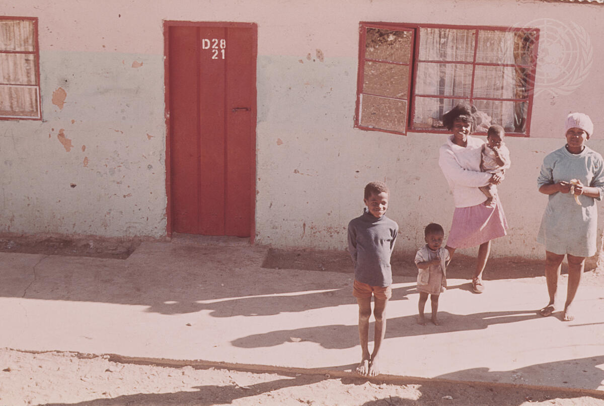 Home of a Damara family in Katutura, the black township that serves as a reservoir of labour for Windhoek, the capital. Under the South African Government's race classification laws, the black townships are not just separated from the white towns they serve but also segregated within themselves into tribal compounds. The houses are marked on the doors with the tribe's initial. Hence D for Damara, street 28, house 21.
