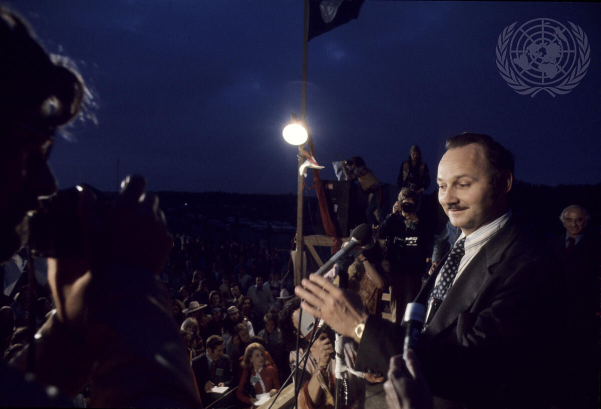 Maurice Strong, Secretary-General of the Conference, addressing a group of people at a “Whale Celebration” held at Skarpnack. One of the recommendations made at the Conference was – Governments should reach an international agreement to stop the commercial hunting of whales for 10 years, and should prepare conventions to protect migratory animals and those that inhabit international waters; a global programme should be initiated to preserve the world’s genetic resources through conservation and seed banks. [5-16 June 1972]