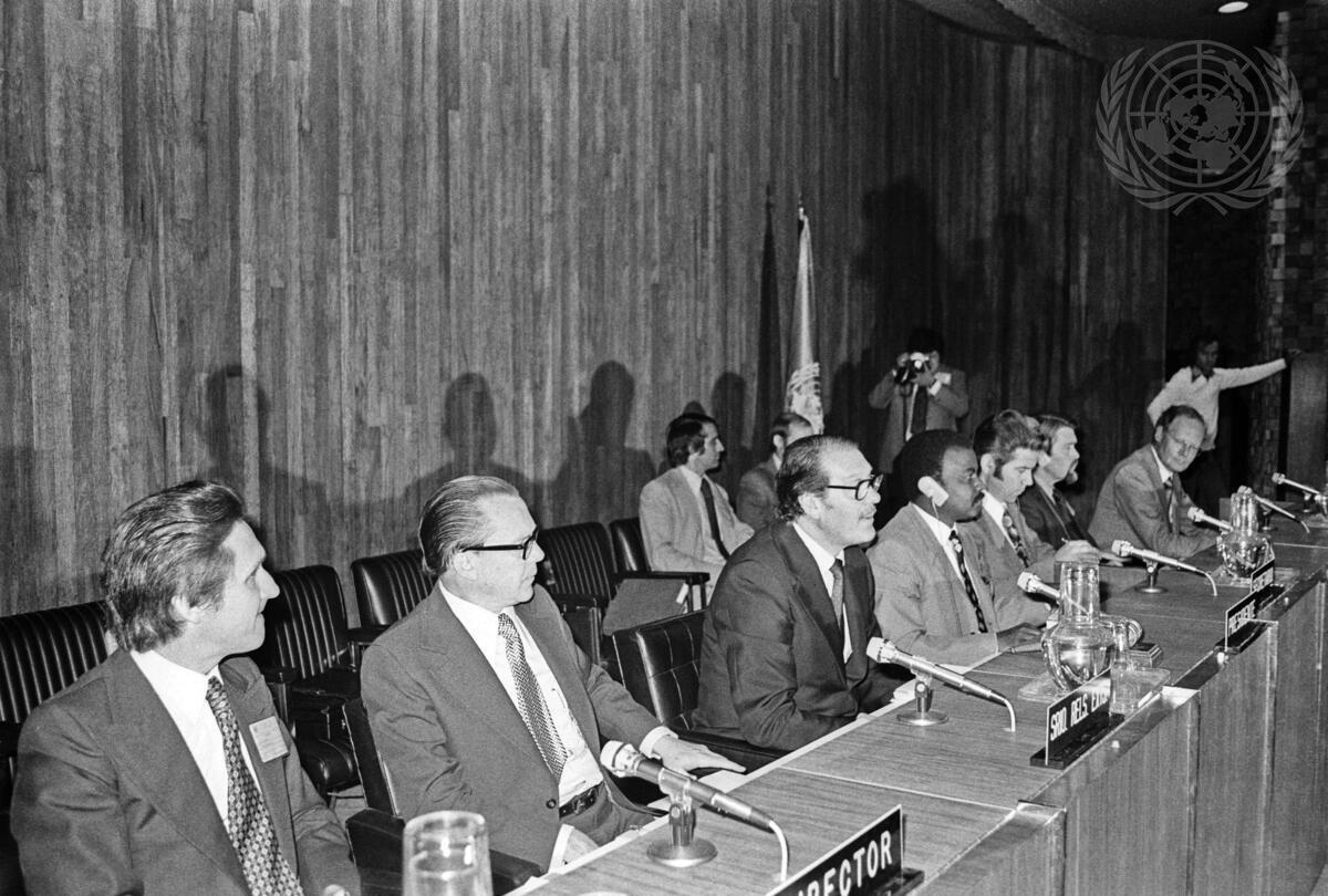 A view of the presiding table at the opening of the session. Left to right: Mr. Jean Pierre Martin, UNCTAD Director in Charge of Working Group Session; Mr. Emilio O. Rabasa, Minister of Foreign Affairs of Mexico; Ambassador Jorge Castaneda, President of UNCTAD IV Working Group; Mr. Moses Adebanjo, Secretary of the Working Group; Mr. Krasnov, Secretary of the Commission; Mr. D. Caufield, Legal Advisor; and Mr. R. Moehler, Rapporteur. [Exact date unknown]
