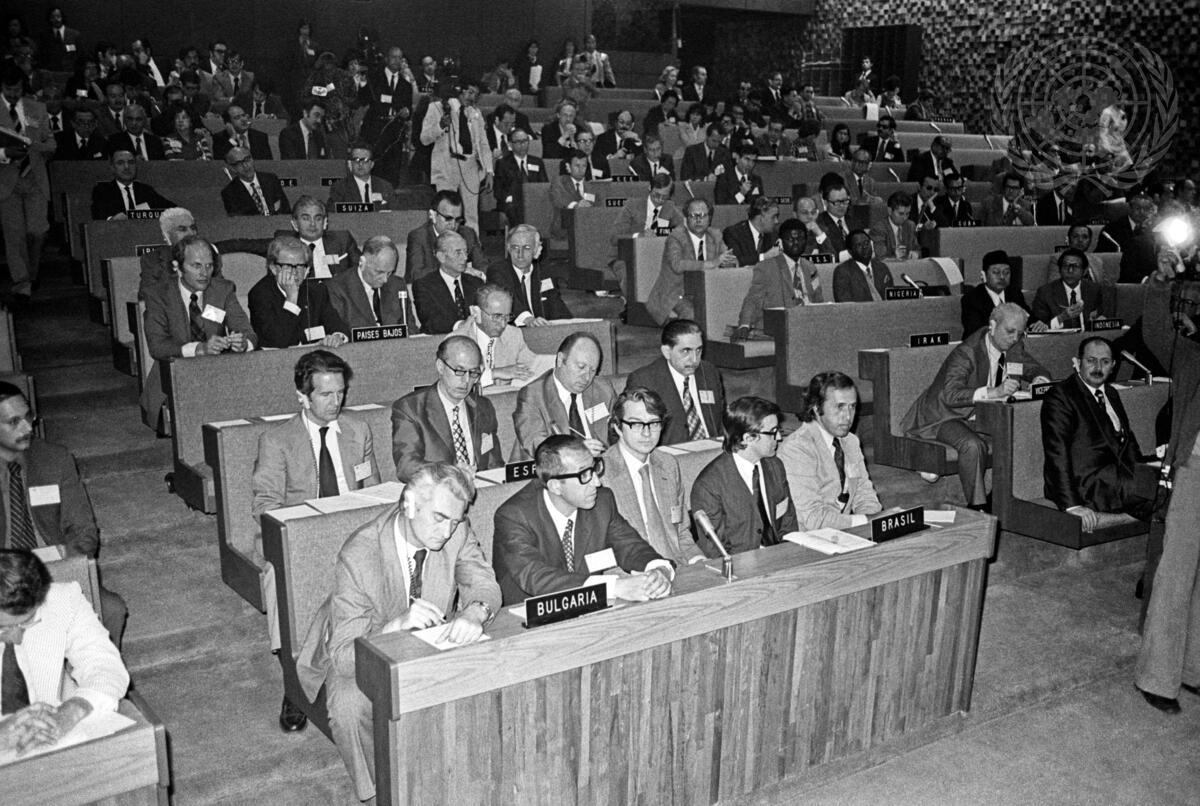 A partial view of the meeting. Left to right at the foreground table: Delegation of Bulgaria: Mr. Botcho Markovski, Mr. Dimitar Popov, Delegation of Brazil: Mr. Libert Westphalen, Mr. Luiz Villarinho Pedroso and Mr. Guilherme R. Barbedo Arroio. [Exact date unknown]