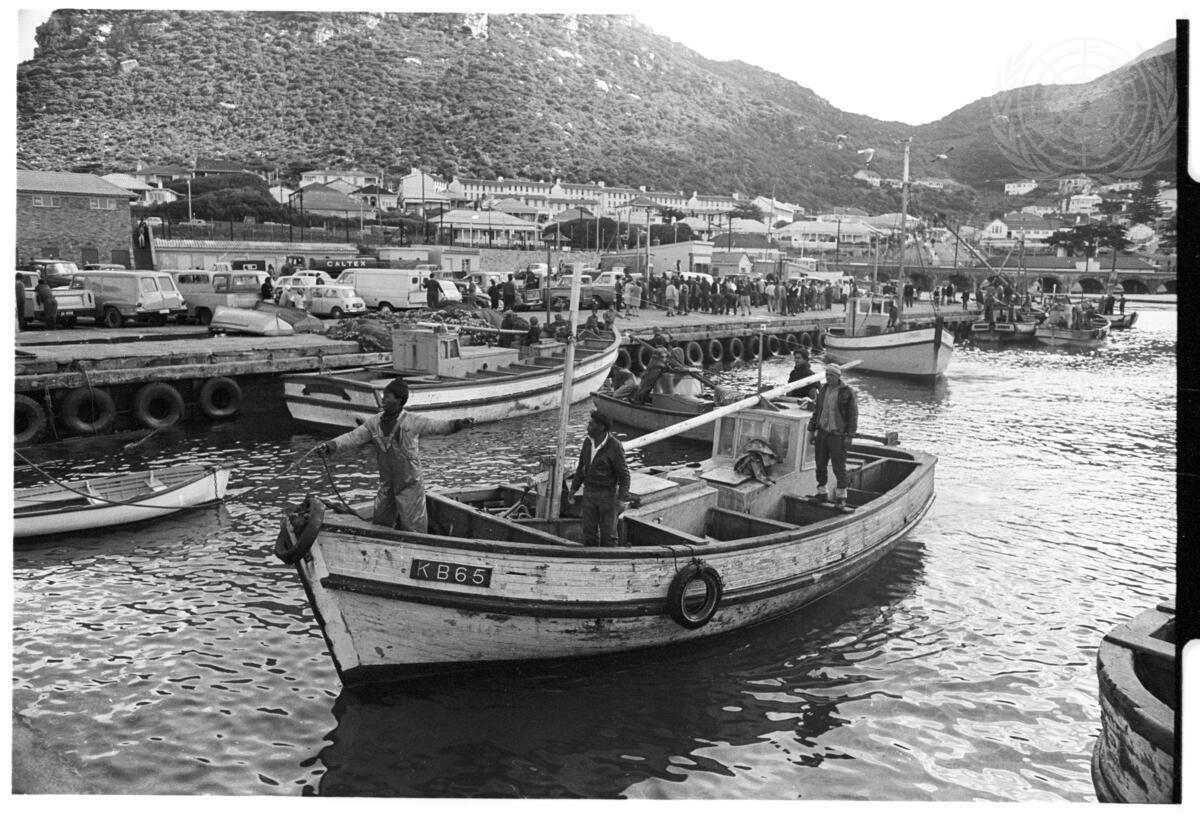 View of Kalk Bay fishing harbor, near Capetown. Although still an integrated community, the Government is allegedly planning to turn it into an all-White area. [1970]