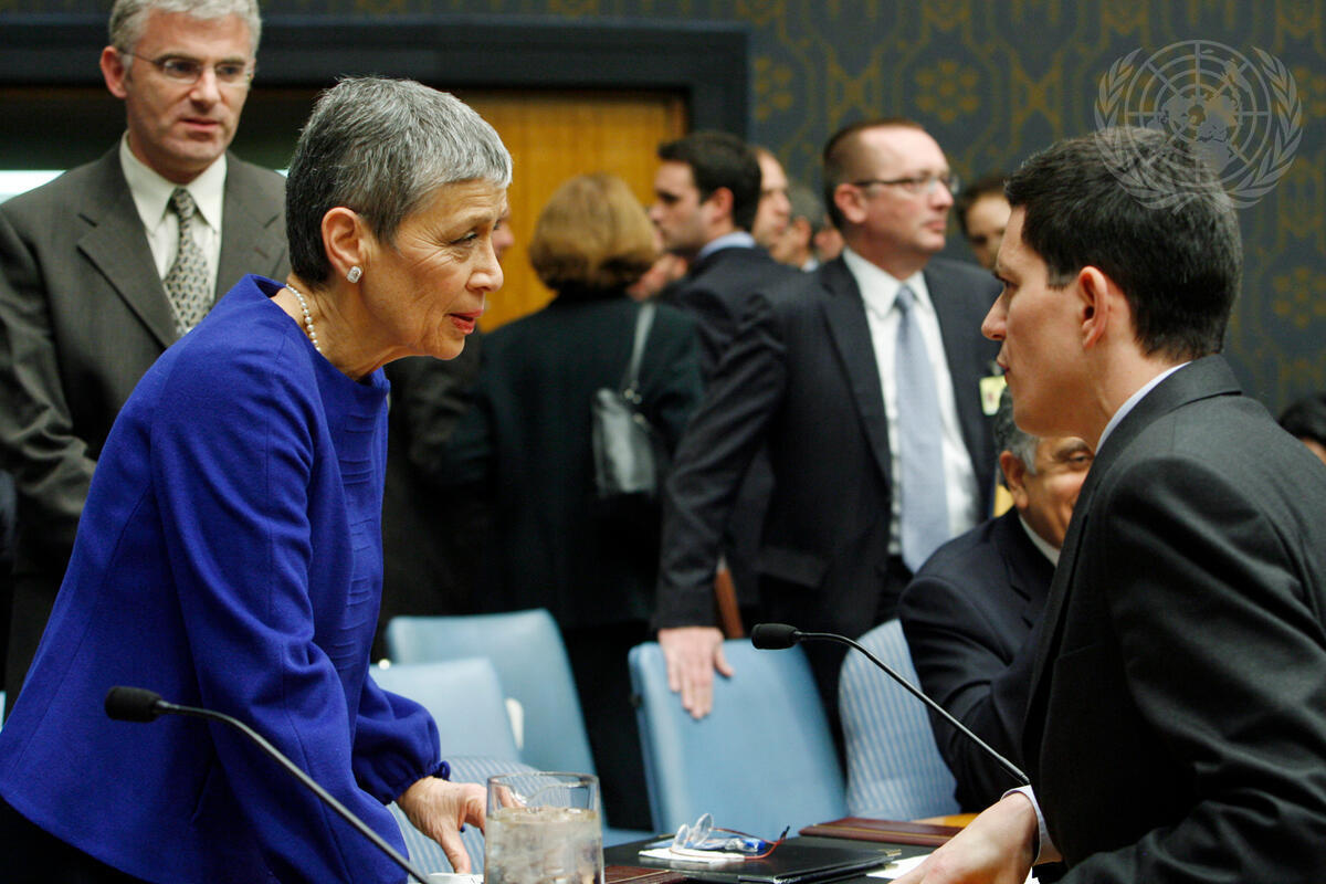 Gabriela Shalev (second from left), Permanent Representative of Israel to the United Nations, speaks with David Miliband, Secretary of State for Foreign and Commonwealth Affairs of the United Kingdom of Great Britain and Northern Ireland, on the floor of the Security Council Chamber prior to a meeting on the situation in the Middle East, including the Palestinian question.
