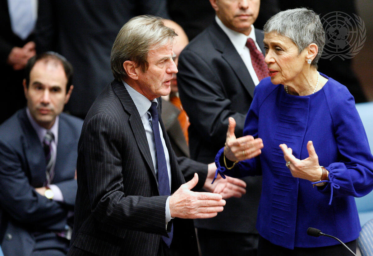 Gabriela Shalev (right), Permanent Representative of Israel to the United Nations, speaks with Bernard Kouchner, Minister for Foreign Affairs of France, on the floor of the Security Council Chamber prior to a meeting on the situation in the Middle East, including the Palestinian question.