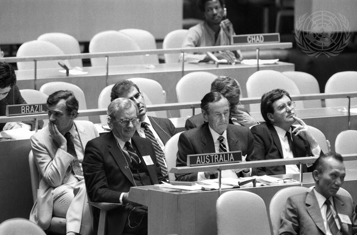 The delegation of Australia headed by the Minister for Foreign Affairs, W.G. Hayden (left), listening to a speaker in the general debate on 1 October. To his left is Richard A. Woolcott, Permanent Representative to the UN.