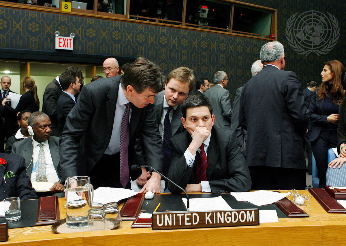 John Sawers (left), Permanent Representative of the United Kingdom of Great Britain and Northern Ireland to the United Nations, confers with David Miliband (seated), Secretary of State for Foreign and Commonwealth Affairs of the United Kingdom of Great Britain and Northern Ireland, prior to a Security Council meeting on the situation in the Middle East, including the Palestinian question.
