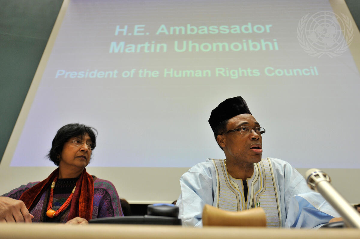 Martin Uhomoibhi (right), Permanent Representative of Nigeria to the United Nations Office at Geneva and President of the Human Rights Council, addresses the ninth special session of the Human Rights Council on the situation in Gaza, as Navi Pillay, United Nations High Commissioner for Human Rights, listens.