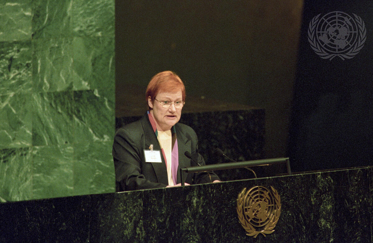 Tarja Halonen, Foreign Minister of Finland, addresses the meeting in the General Assembly hall.
