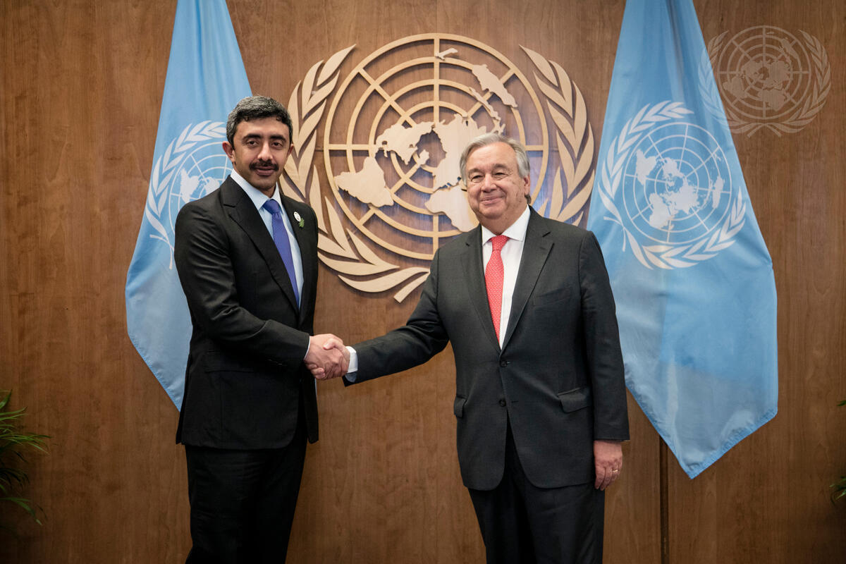Secretary-General António Guterres (right) meets with Sheikh Abdullah Bin Zayed Al Nahyan, Minister for Foreign Affairs and International Cooperation for the United Arab Emirates.