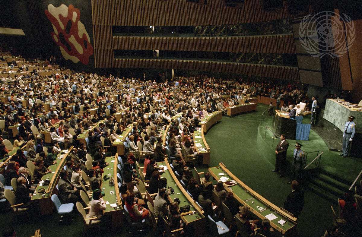 A general view of the United Nations staff in General Assembly Hall as Secretary-General Boutros Boutros-Ghali introduces His Holiness Pope John Paul II prior to his address to the staff.