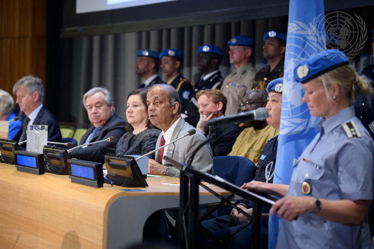 Atul Khare (second from right at table), Under-Secretary-General for Operational Support, speaks at the ceremony. At left is Jean-Pierre Lacroix, Under-Secretary-General for the Department of Peace Operations; Secretary-General António Guterres; and Maria Luiza Ribeiro Viotti, Chef de Cabinet.