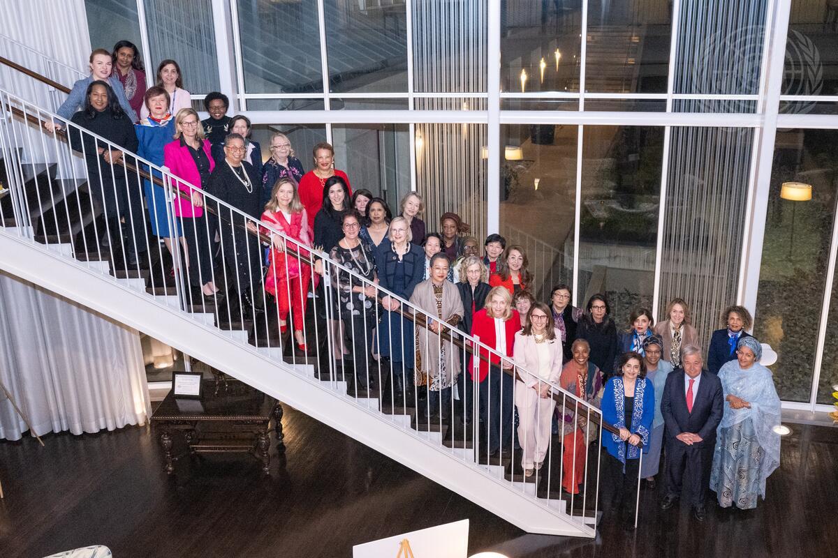 Deputy Secretary-General Amina Mohammed (right in front) and Secretary-General António Guterres (second from right) pose for a group photo with United Nations Senior Women Leaders.