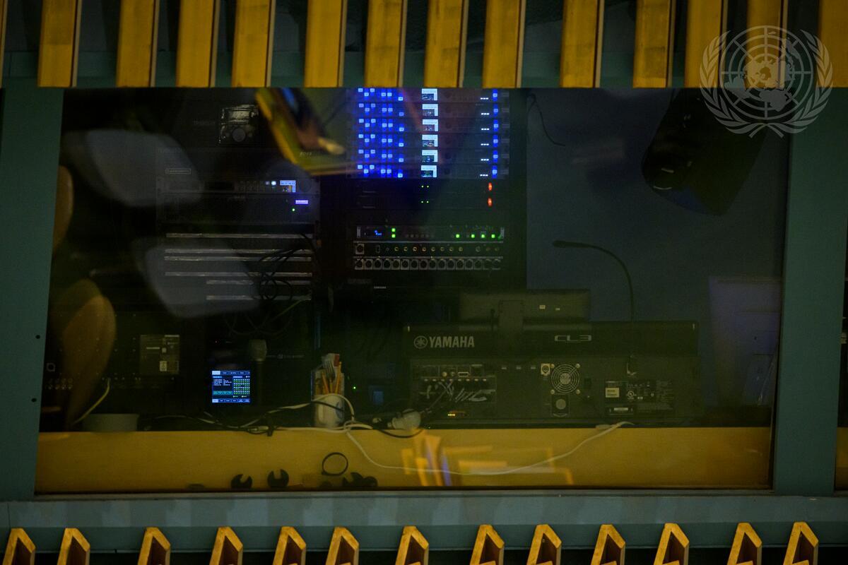 A view of the sound system booth during the General Assembly meeting on the use of veto in the Security Council.