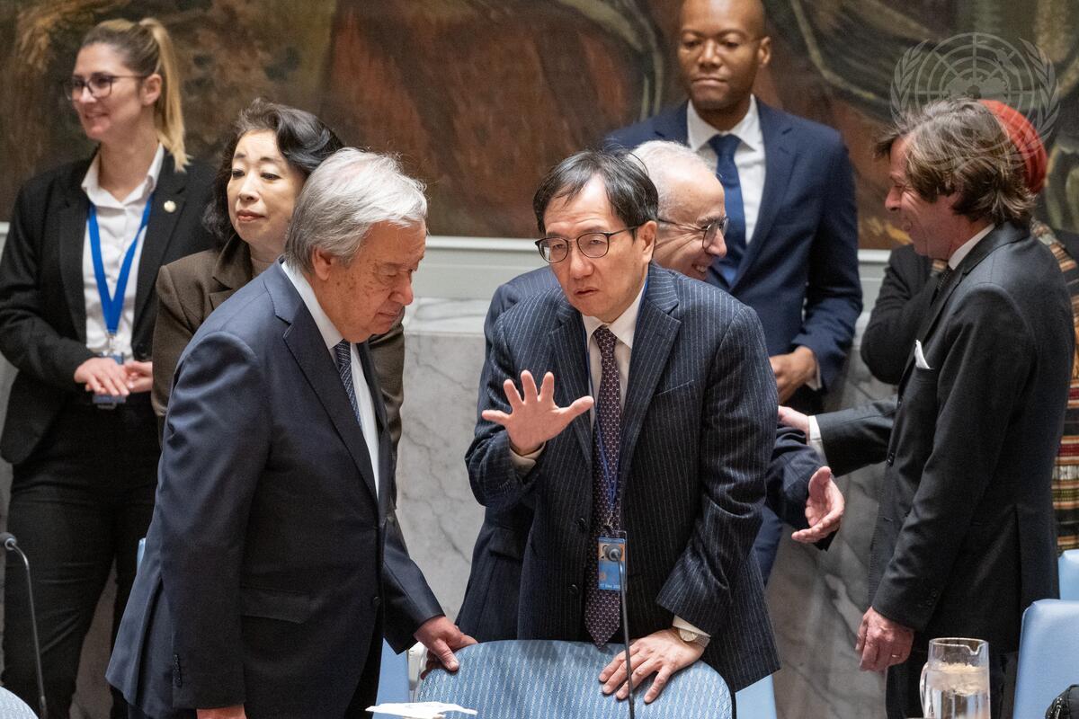 Secretary-General António Guterres (front left) speaks with Yamazaki Kazuyuki, Permanent Representative of Japan and President of the Security Council for the month of March, ahead of the Security Council meeting on the situation in the Sudan and South Sudan. The Council heard Reports of the Secretary-General on the Sudan and South Sudan.