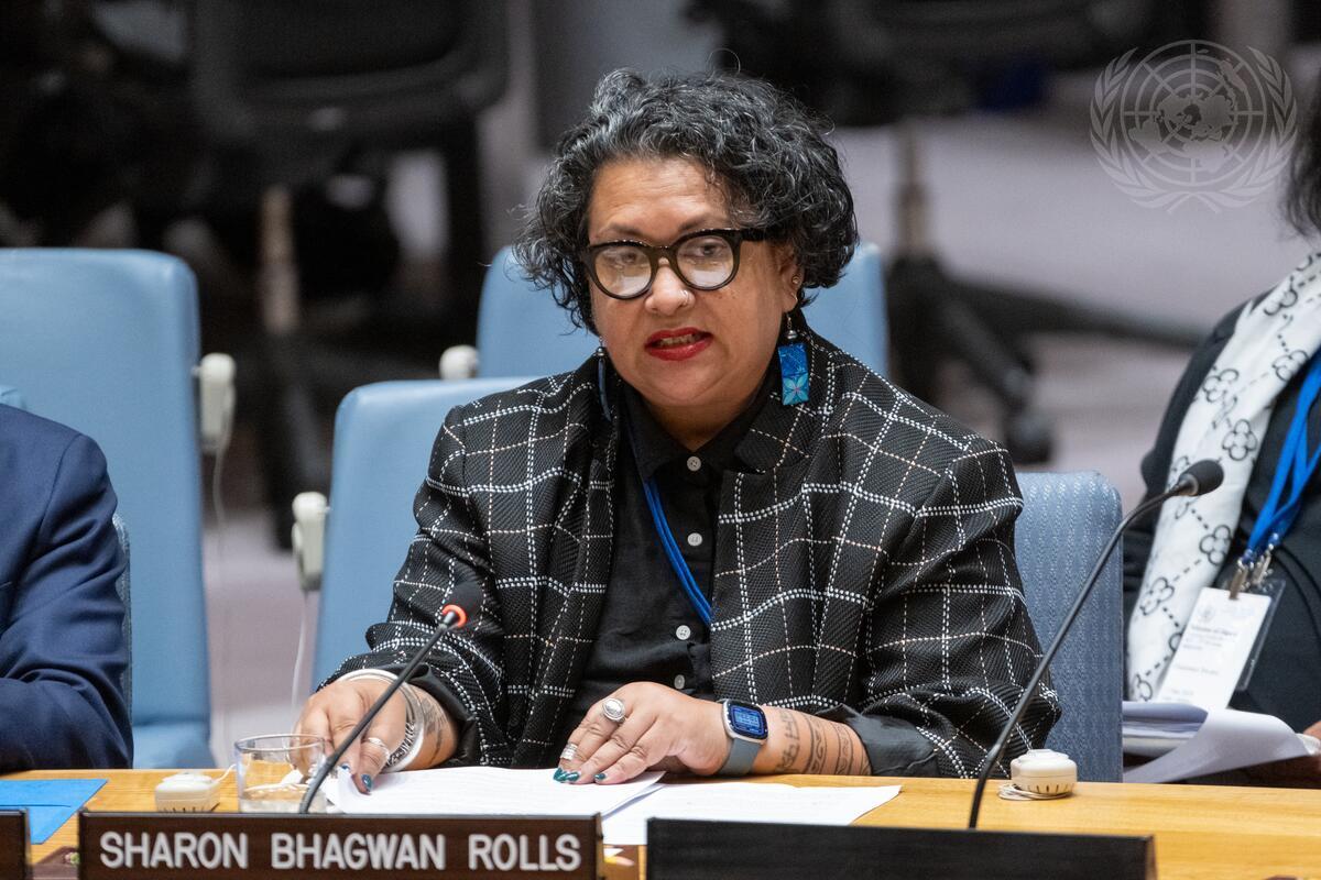 Sharon Bhagwan Rolls, Programme Manager at the Pacific Women Mediators Network and International Steering Group Gender Liaison of Global Partnership for the Prevention of Armed Conflict (GPPAC), briefs the Security Council meeting on peacebuilding and sustaining peace, with a focus on promoting conflict prevention and empowering all actors including women and youth.